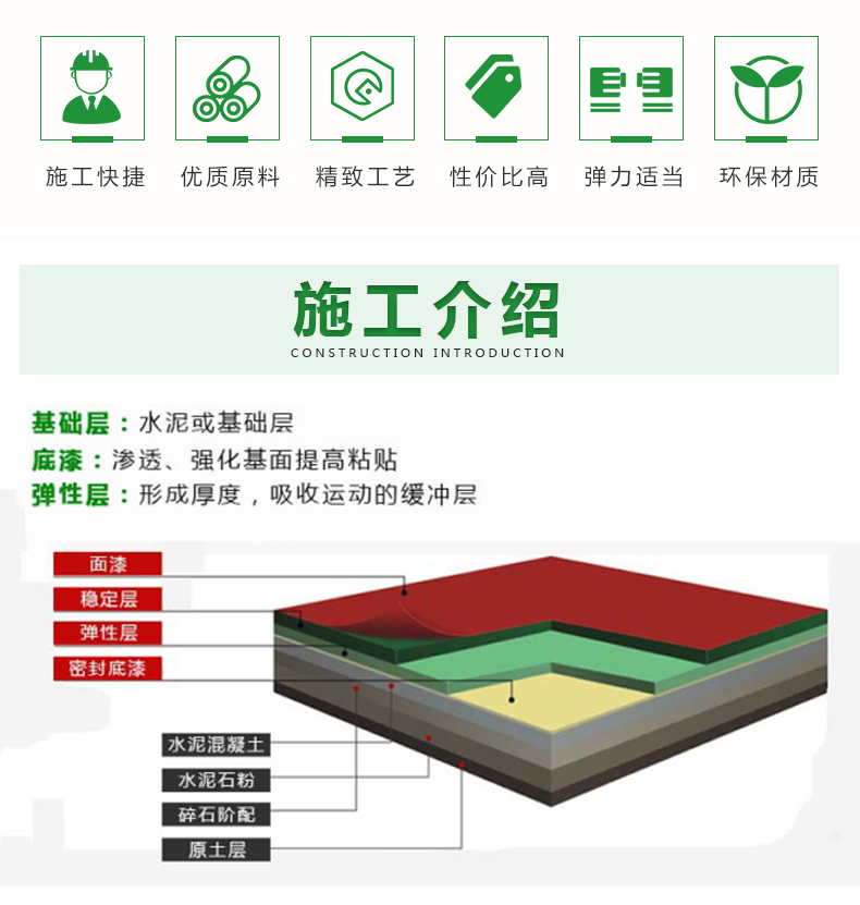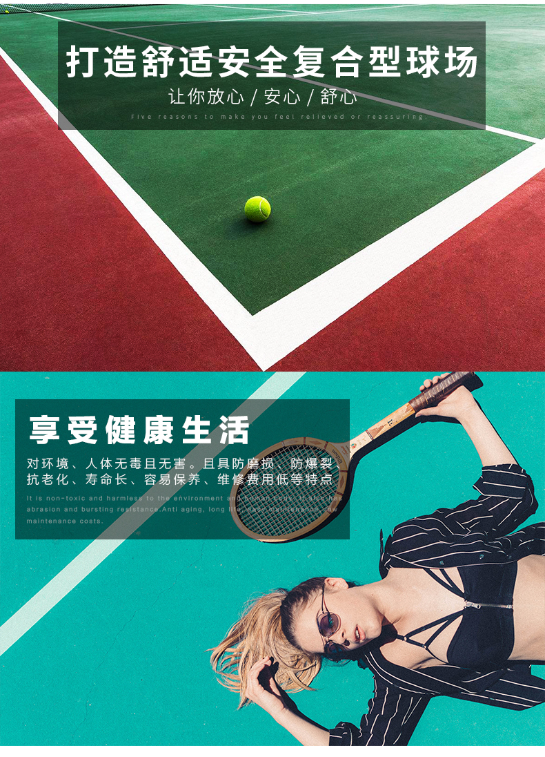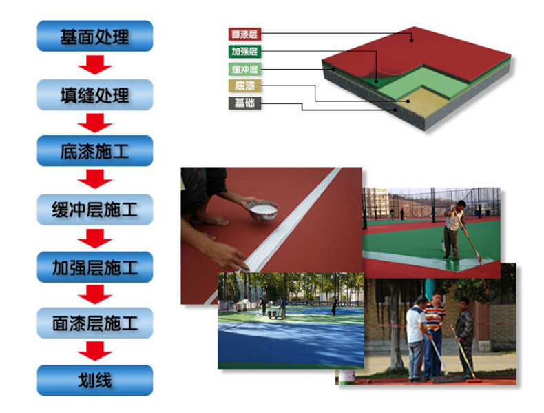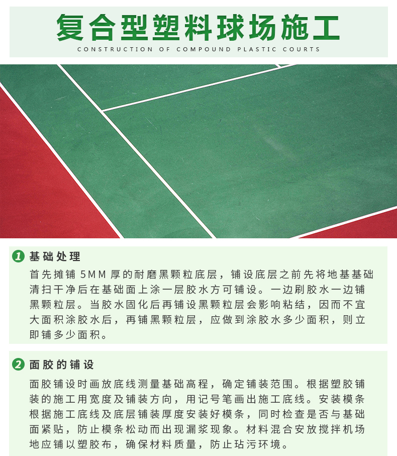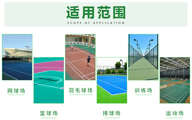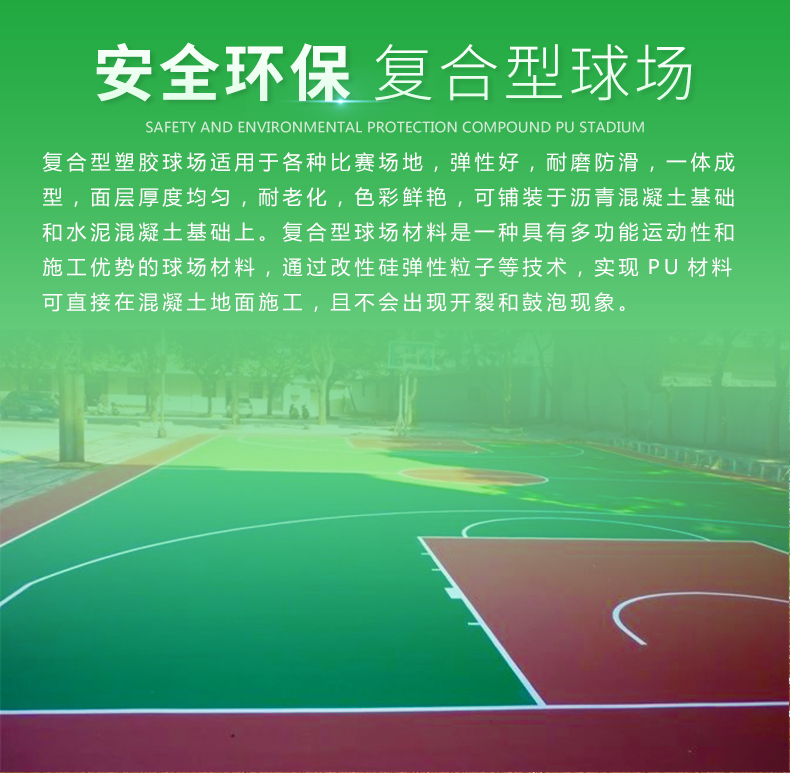 复合型塑胶球场适用于各种比赛场地,弹性好,耐磨防滑,一体成型,面层厚度均匀,耐老化,色彩鲜艳,可铺装于沥青混凝土基础和水泥混凝土基础上。复合型球场材料是一种具有多功能运动性和施工优势的球场材料,通过改性硅弹性粒子等技术,实现PU材料可直接在混凝土地面施工,且不会出现开裂和鼓泡现象。