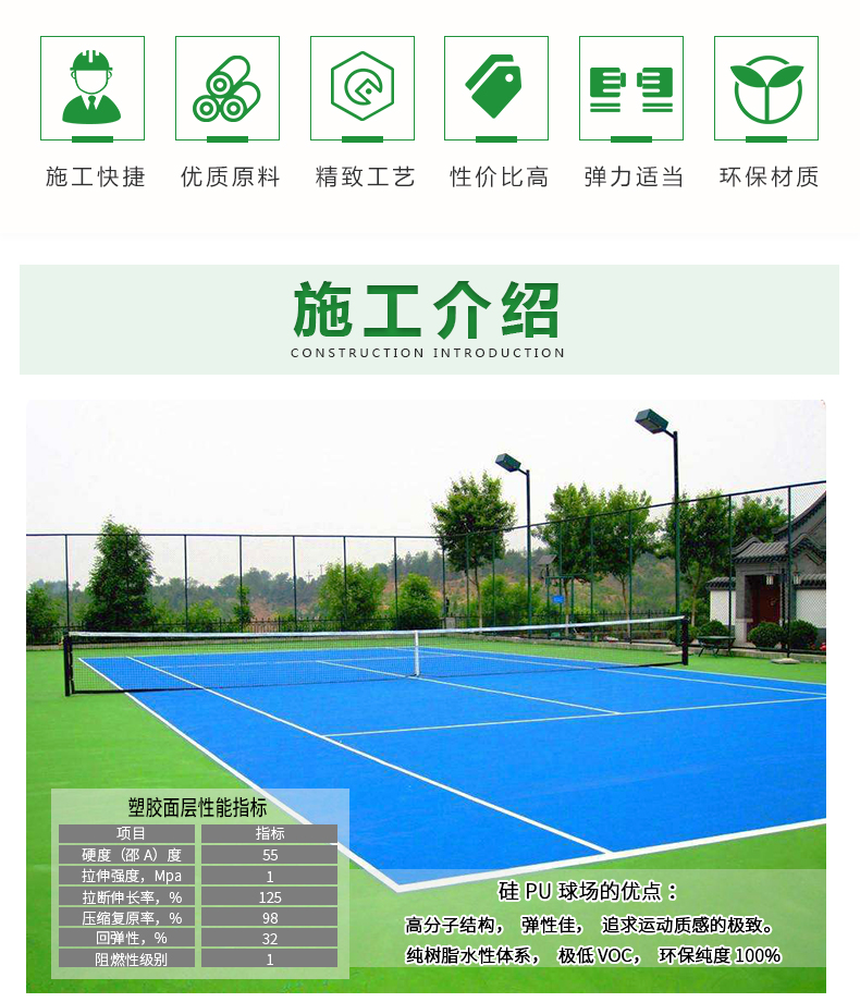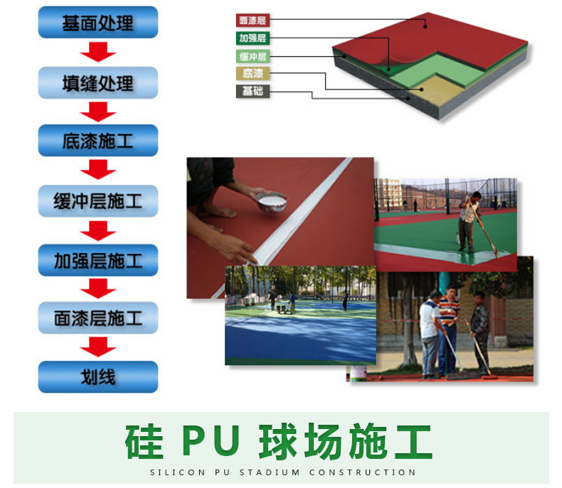 硅PU球场材料(SPU)是在PU球场材料的基础上开发研制出来的新一代球场铺面材料。该材料是以聚氨酯(PU)材料与含有有机硅成分的材料科学地复合在一起,所生产出来的材料用在球场面层上,从根本上有效地解决了PU球场材料在专业性能、环保施工、使用寿命、日常维护等方面的不足,具有革命性的创新性能。